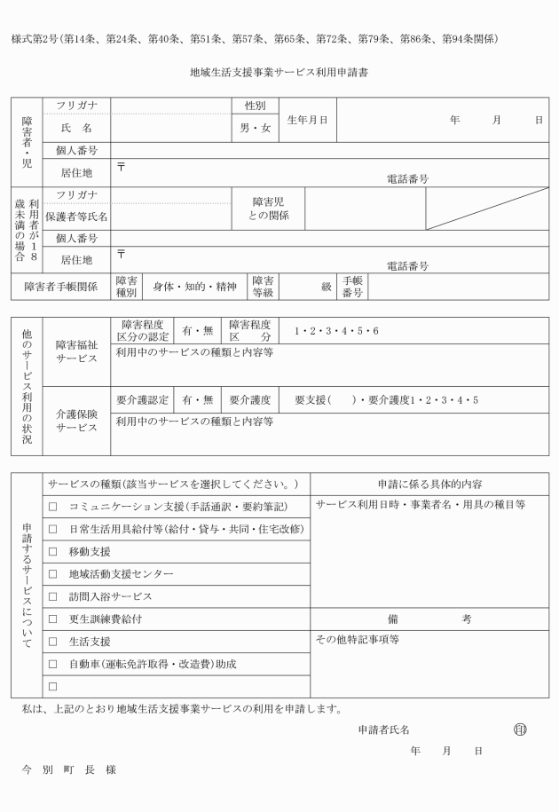 第14条 事業を利用しようとする障害者等又はその保護者等(以下「申請者」という。)は、地域生活支援事業サービス利用申請書(様式第2号)により町長に申請するものとする。ただし、町長が特に必要と認める場合は、ファクシミリ等により申請することができる。